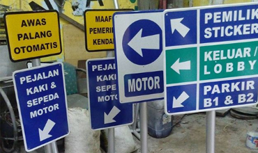Kami membuat berbagai macam Signboard & Signage Petunjuk Outdoor & Indoor, seperti Rambu Lalu Lintas & Parkir, Rambu K3 (Safety & Emergency Signs), Papan/ Plang Nama Toko/ Perusahaan, Papan Peraturan, dengan bahan Cutting Sticker Reflektif ( Schotlite) atau Sticker Digital Printing dengan Plat Allumunium, Plat Galvanil, Stainless Steel, Acrylic, dll.